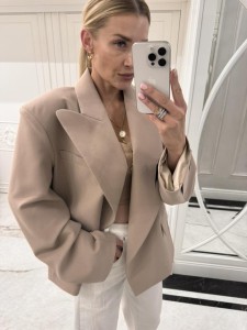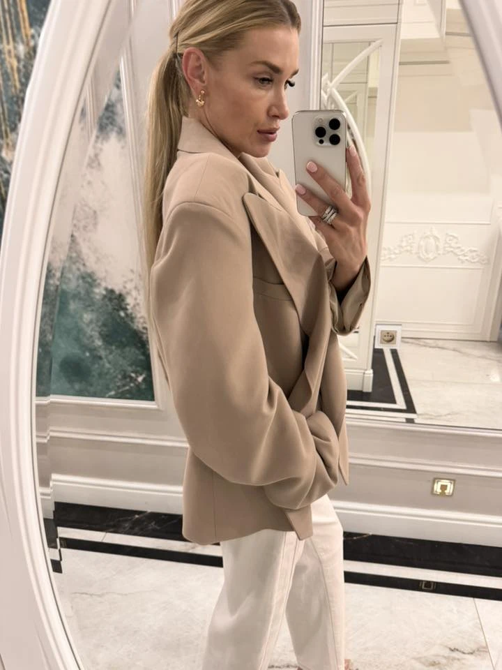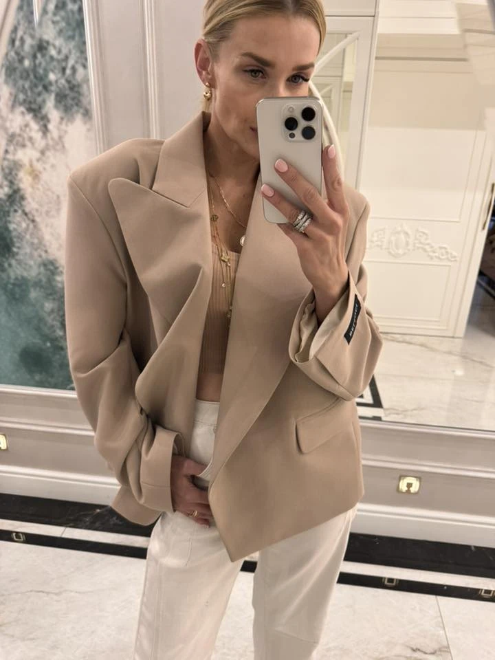 Prawdziwa klasyka, której potrzebuje Twoja szafa. Idealnie skrojona, beżowa marynarka oversize z przeskalowanymi klapami.