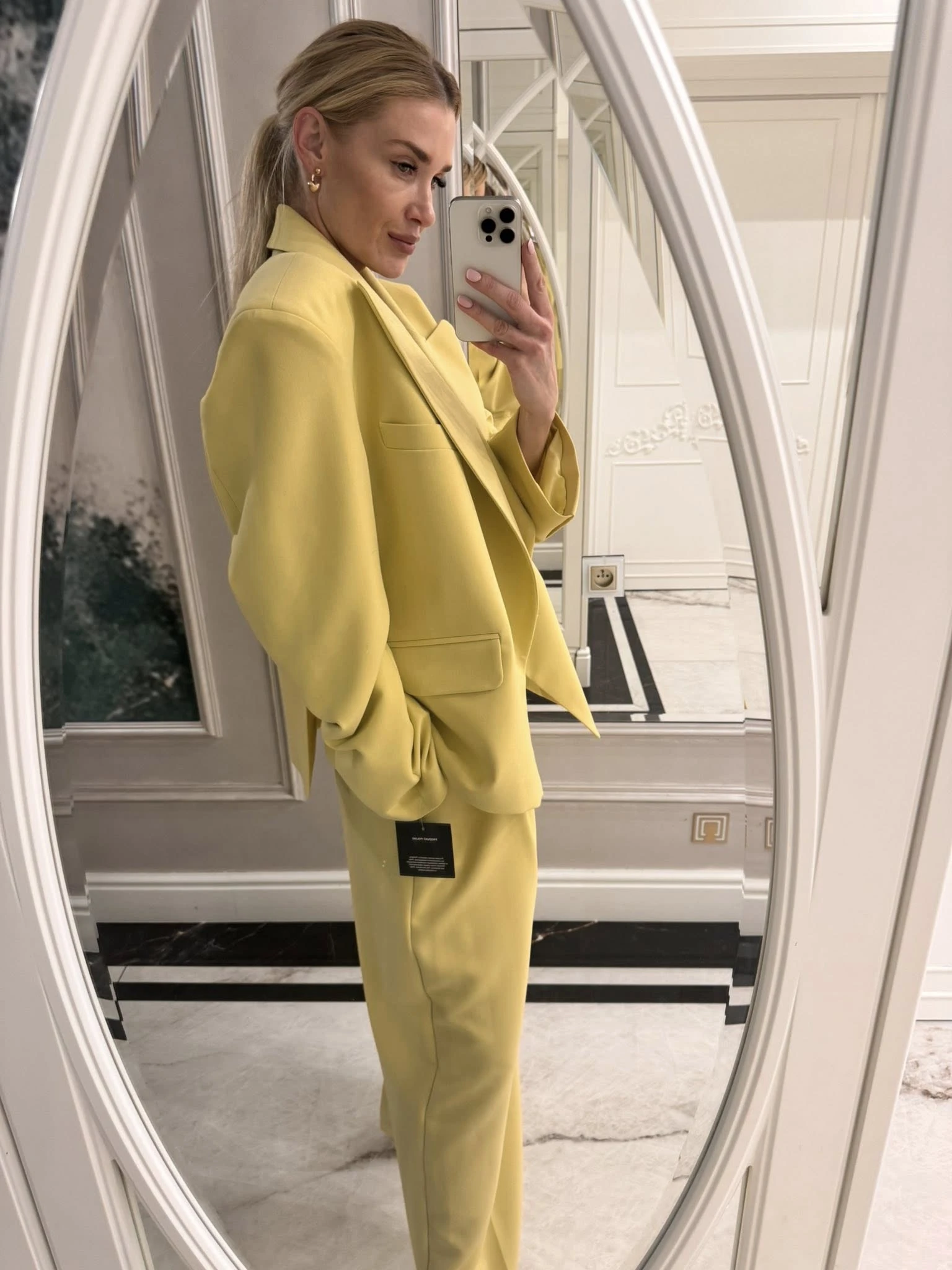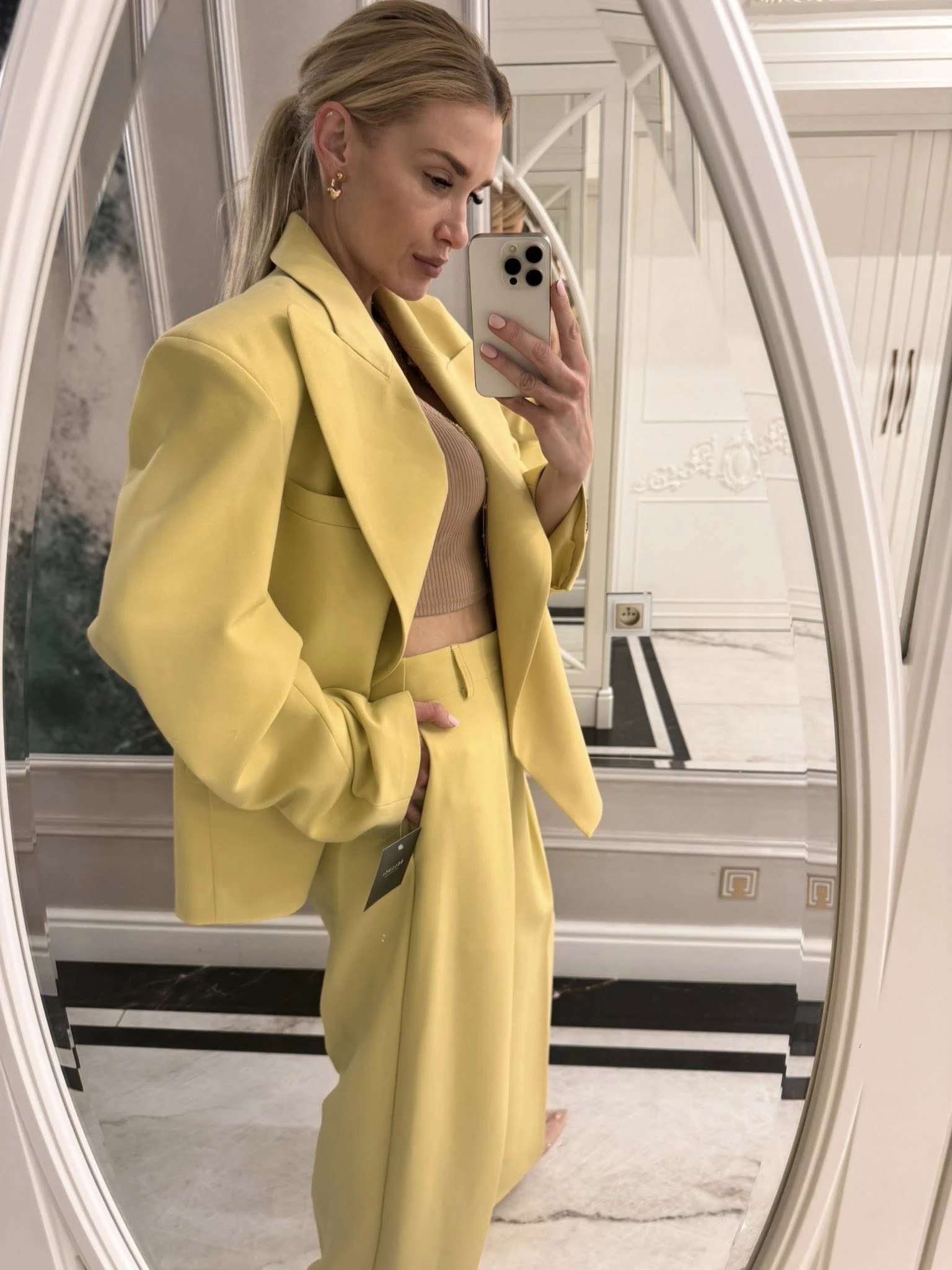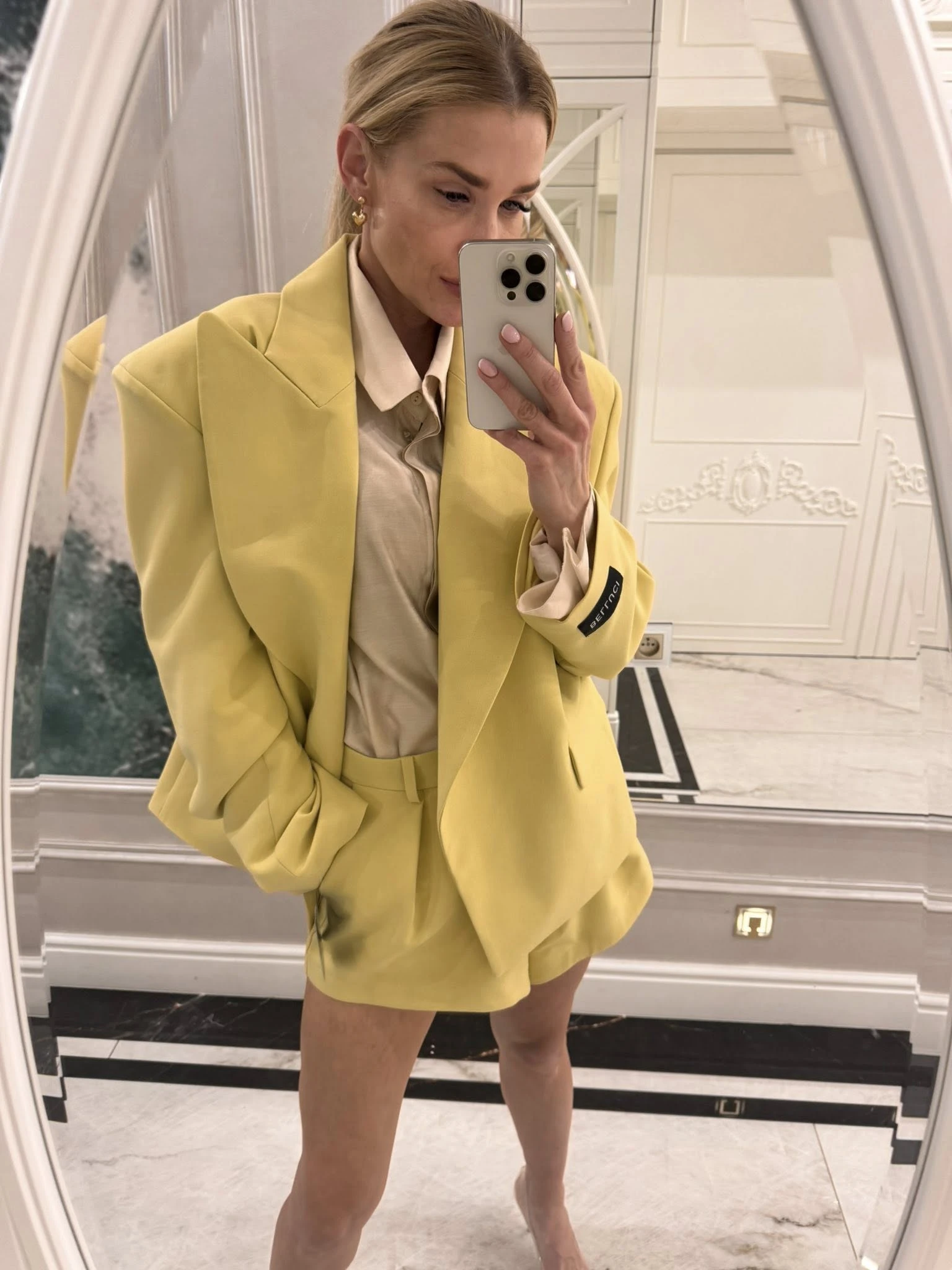 Świeżość i elegancja w jednym. Energetyczny, pastelowo-żółty komplet z marynarką oversize i dopasowanymi szortami.